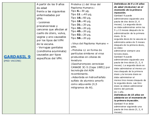 Indicaciones y pautas de administración para grupos de riesgo por infección del virus VPH