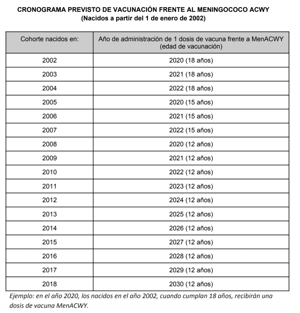 ● Vacunación sistemática en adolescentes a los 12 años de edad. Se sustuirá la vacuna MenC por la vacuna MenACWY. Este cambio afectara a las personas nacidas a partir del 1 de enero de 2008, cuando cumplan los 12 años de edad.