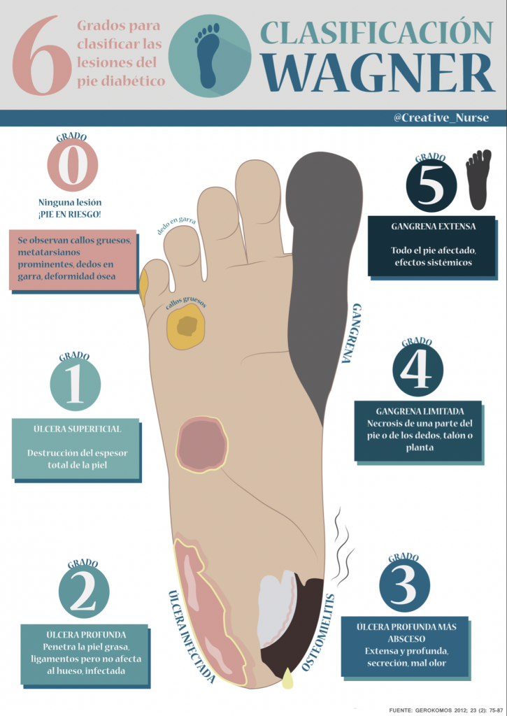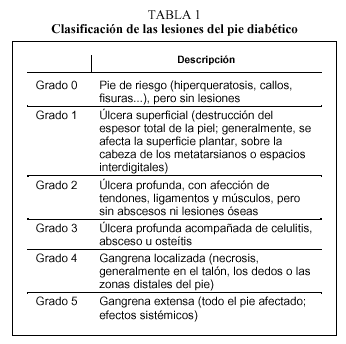 En la mayoría de los casos la aplicación de la terapia adecuada viene determinada por el tipo de lesión y su gravedad; de ahí la importancia de establecer una clasificación. Según Wagner, la afección del pie puede clasificarse en 6 estadios, que abarcan desde la no lesión, hasta la gangrena extensa, tal como se refleja a continuación.