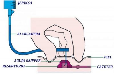 – Puncionar en el centro del reservorio siempre de forma vertical, fijando el reservorio entre los dedos y a presión constante ( Se notará la resistencia de la piel y de la goma de la membrana autosellante, de la que está formada el reservorio y continuar la presión hasta sentir el roce de la punta de la aguja contra el suelo metálico del portal. No se debe mover la aguja ya que podría rasgar la membrana)