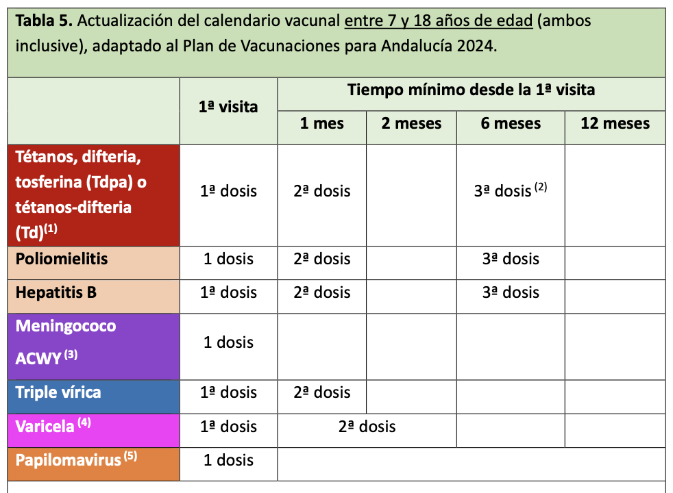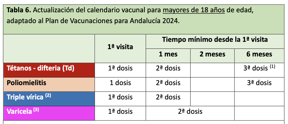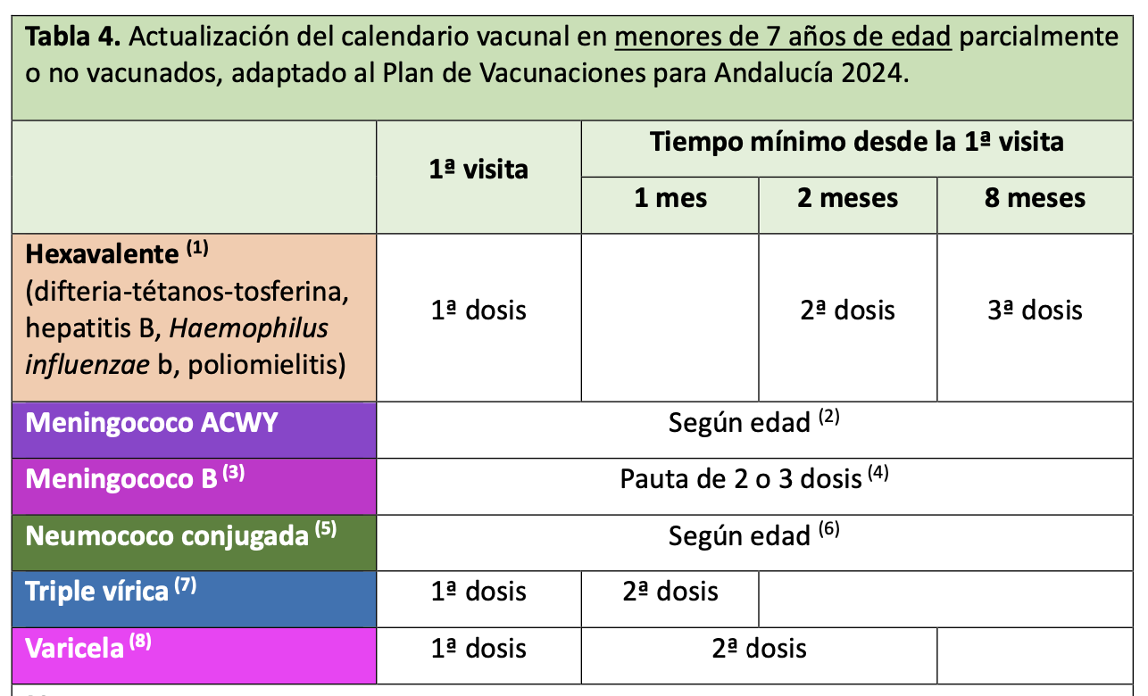 Se administrará el mayor número posible de las vacunas indicadas en cada visita para asegurar la protección con al menos las vacunas prioritarias, que se administrarán lo antes posible. Se debe dar prioridad a la protección frente a enfermedades fácilmente transmisibles o graves. Por lo tanto, es prioritaria la vacunación frente a sarampión y rubeola, poliomielitis, tétanos y difteria en las personas susceptibles de cualquier edad. Otras vacunaciones a considerar según la edad son las vacunas frente a neumococo, meningococo, Haemophilus influenzae tipo b, varicela, hepatitis B y VPH.