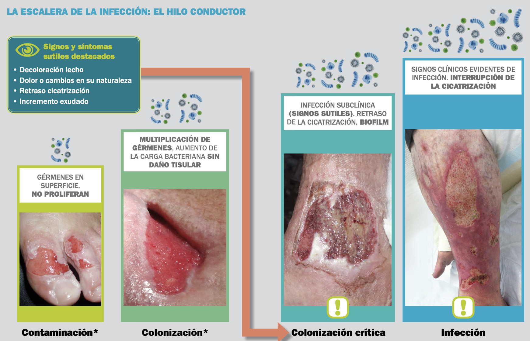 La infección en heridas crónicas es uno de los principales factores que dificulta su cicatrización. Aproximadamente el 70% de las heridas crónicas presentan una alta carga bacteriana, a menudo subestimada por su carácter subclínico. Este fenómeno, conocido como colonización crítica, representa un estado intermedio en el continuo de infección, donde la carga bacteriana, aunque significativa, no presenta los signos clásicos de inflamación.