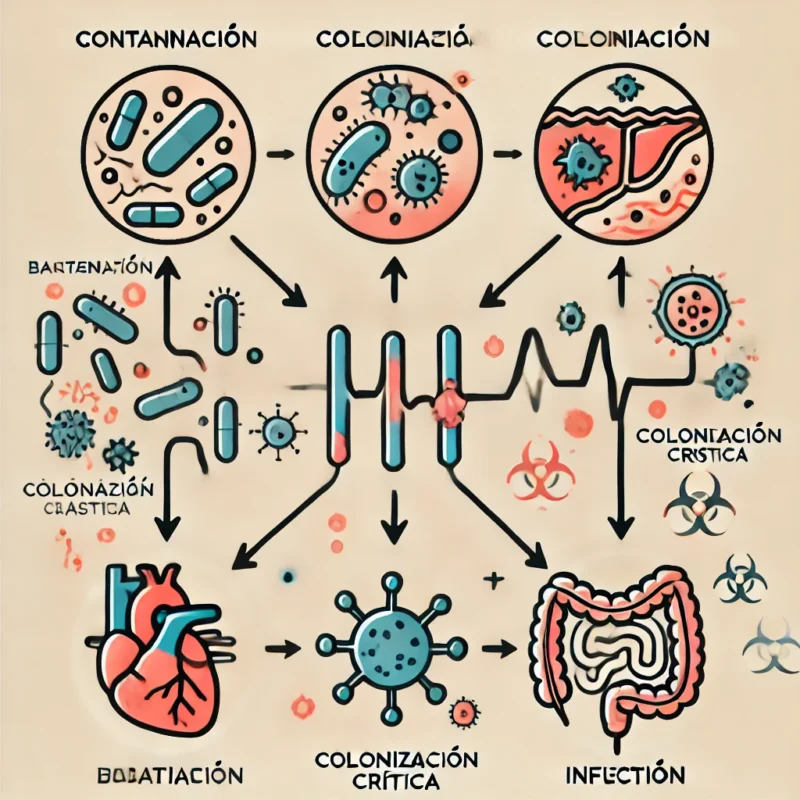 En la progresión bacteriana, desde su presencia en una herida hasta la aparición de una infección podemos encontrar las siguientes fases o estados: