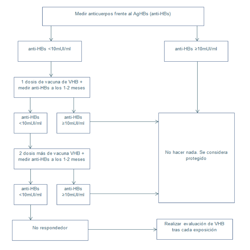 1. Opción 1: Administrar una dosis de refuerzo de la vacuna y repetir la serología 1-2 meses después. Si el resultado sigue siendo negativo, completamos una segunda serie de vacunación con dos dosis más (a los 0 y 5 meses). Si después de esto la serología sigue siendo negativa, consideramos al individuo como no respondedor.
