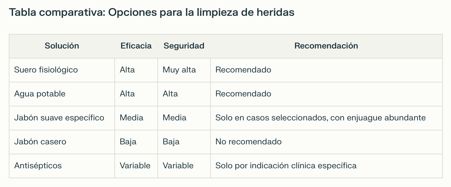 Las revisiones sistemáticas y guías clínicas coinciden en que el suero fisiológico y el agua potable son igual de efectivos o superiores al jabón para la limpieza de heridas, con menor riesgo de toxicidad celular y complicaciones locales. El uso de jabón puede reservarse para heridas muy contaminadas, siempre que se trate de productos suaves, específicos para uso cutáneo, y se realice un enjuague abundante para eliminar residuos.