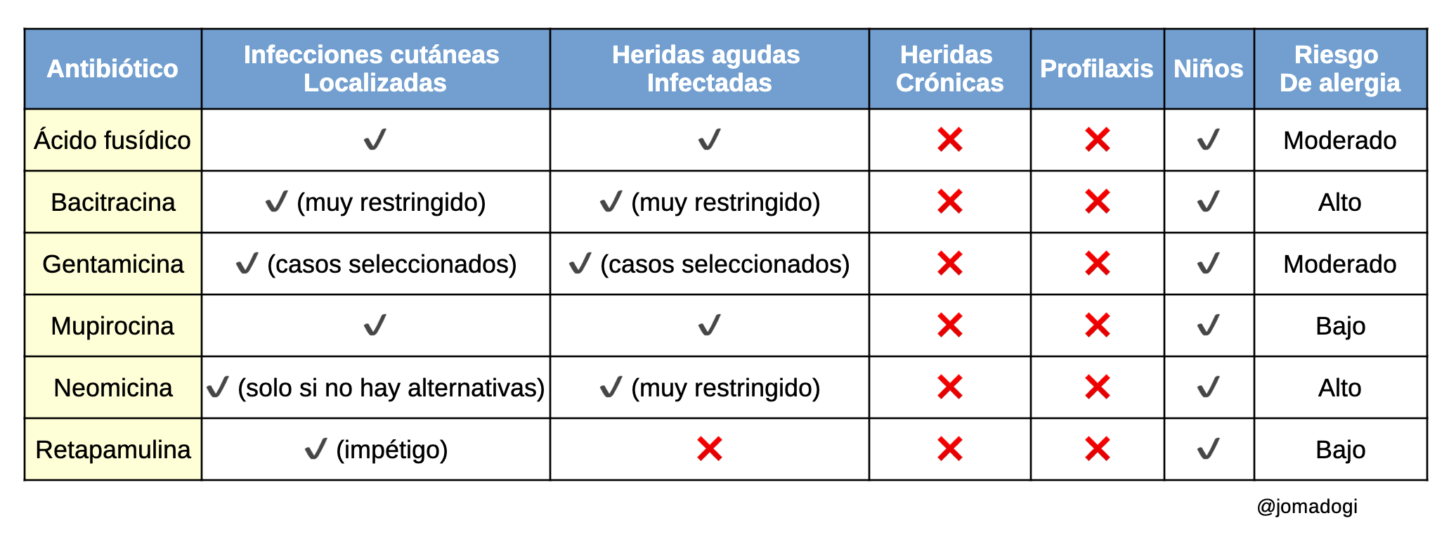 –Tratamiento de infecciones cutáneas superficiales y localizadas: En el manejo de infecciones bacterianas primarias de la piel, como el impétigo no complicado, foliculitis o heridas con colonización crítica en áreas pequeñas, y siempre por periodos cortos (5-10 días), un antibiótico tópico específico para el agente etiológico identificado puede ser la opción más apropiada. La elección del antibiótico debe ser evaluada de forma individualizada, preferentemente con base en cultivo y antibiograma, y priorizando la vía sistémica en infecciones profundas.